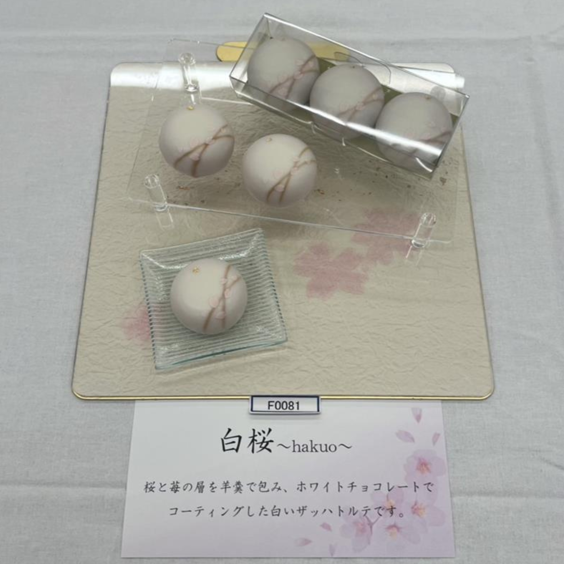 :“我想制作一款前所未有的萨赫蛋糕,于是创作了这件作品。我用白巧克力打造外观,并以玻璃箭装饰,营造出类似萨赫蛋糕的质感。为了赋予它真正的日式风味,我用自制的樱花豆沙馅包裹着散发着樱花香气的卡斯特拉蛋糕。”
